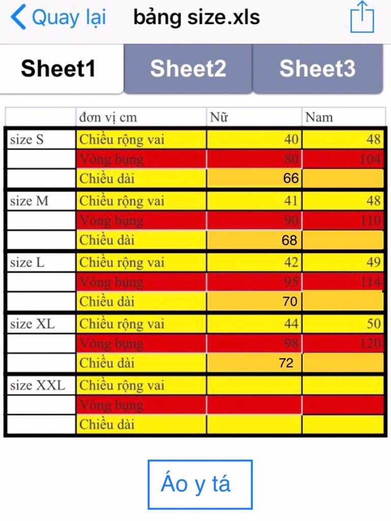 Các bạn có thể chọn áo - quần theo thông số dưới