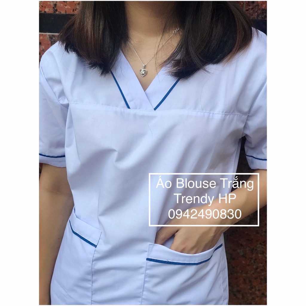 Bộ blouse cổ tim nam nữ- bộ scrubs kỹ thuật viên màu trắng có viền xanh nam nữ cộc tay cho bác sỹ, điều dưỡng, dược sỹ