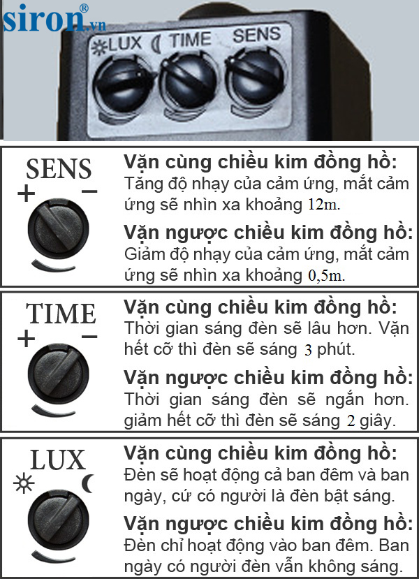 Nút ánh sáng: Vặn nút ánh sáng (LUX) về phía mặt trăng thì chỉ cảm ứng khi không đủ ánh sáng (Khi trời tốt), vặn về phía mặt trời thì cảm ứng cả ban ngày và ban đêm. Chức năng này giúp tiết kiệm điện vì vào ban ngày thì có ánh sáng mặt trời nên sẽ không cảm ứng.