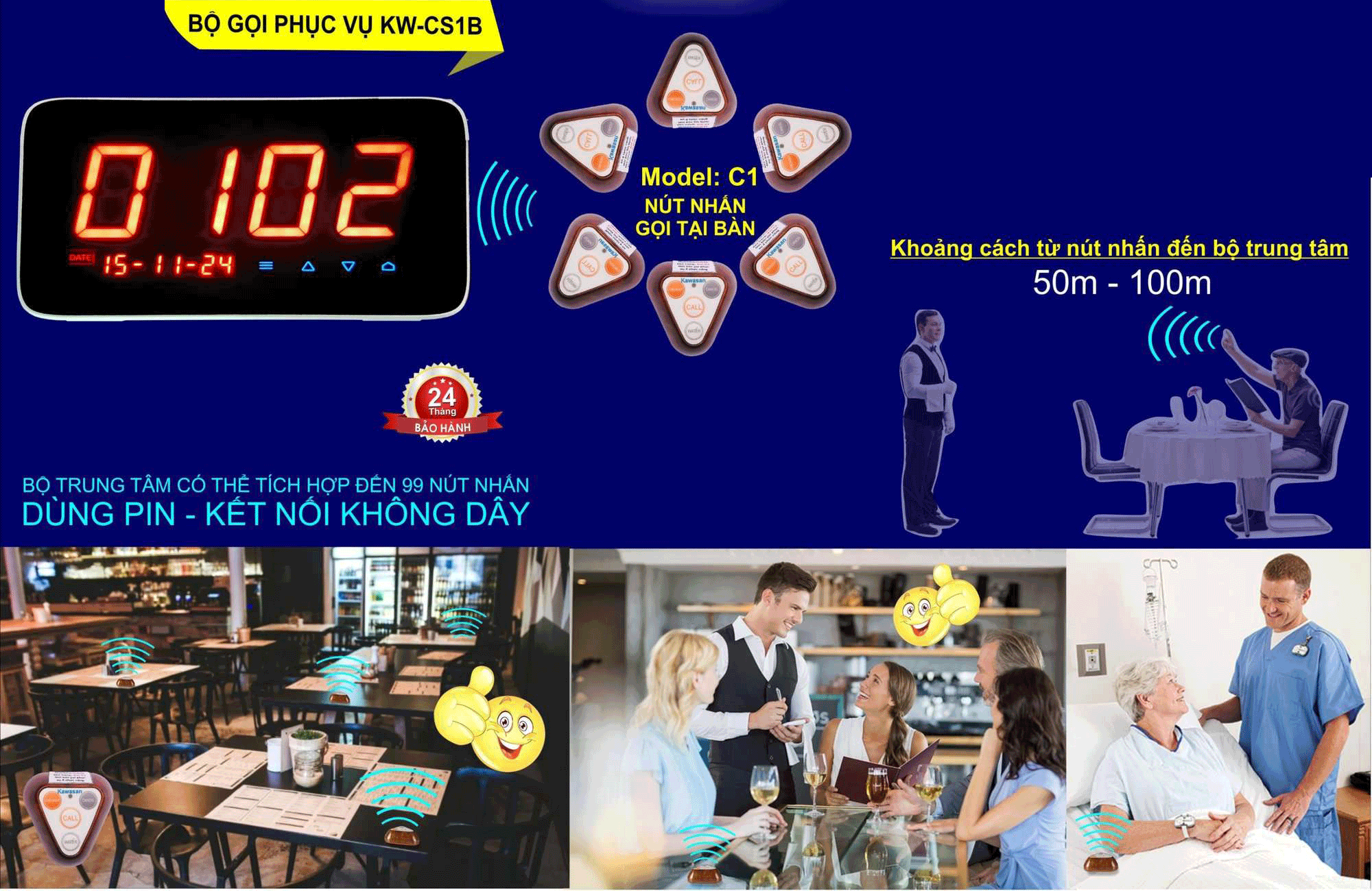- Tích hợp được 999 thiết bị gọi phục vụ không dây. Thêm được remote điều khiển từ xa.