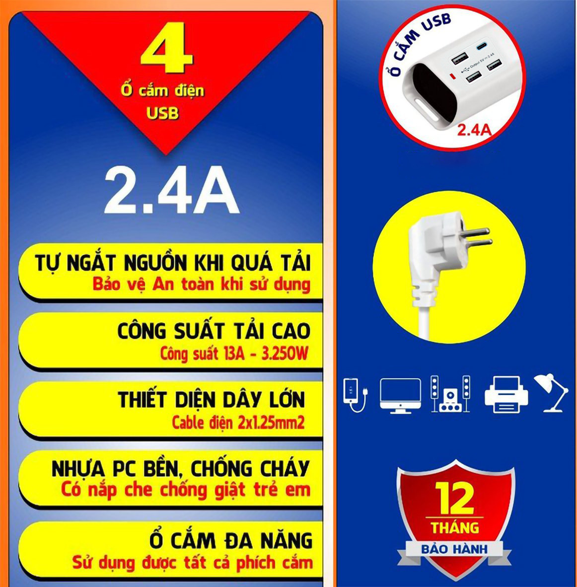 - Thiết kế có 3 lỗ cắm 3 chân, dùng được cho tất cả các loại phích cắm và có nút bật - tắt nguồn tiện lợi.