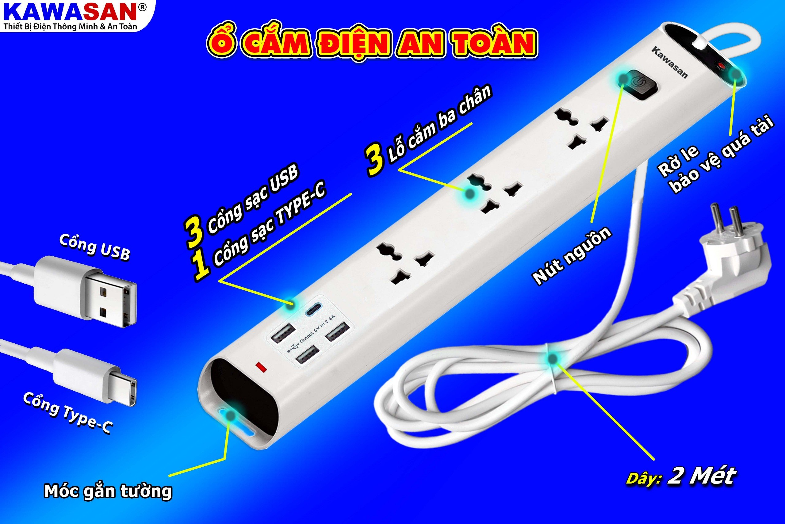 Ổ cắm điện đa năng có cổng USB và ổ cắm Type-C dân dụng cáp dây 2m Kawasan 4L-4U-2M