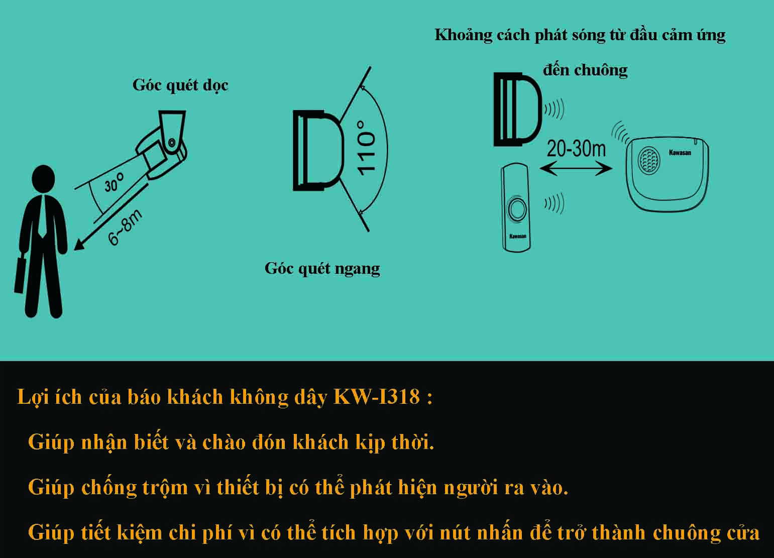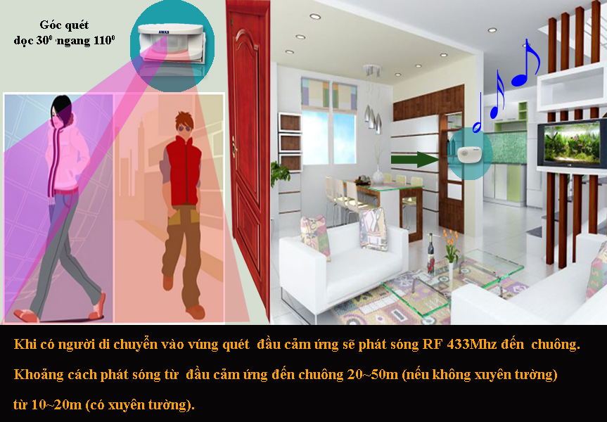 Đây là sản phẩm báo khách cảm hồng ngoại, hoạt động nhờ phát hiện sự chuyển động của con người khi đi qua khu vực quét, có thể tích hợp thêm nhiều chuông báo hoặc thêm nhiều đầu cảm ứng cùng một lúc, khi nhà có nhiều cửa hoặc nhiều tầng có thể mua rời thêm về tích hợp vào.